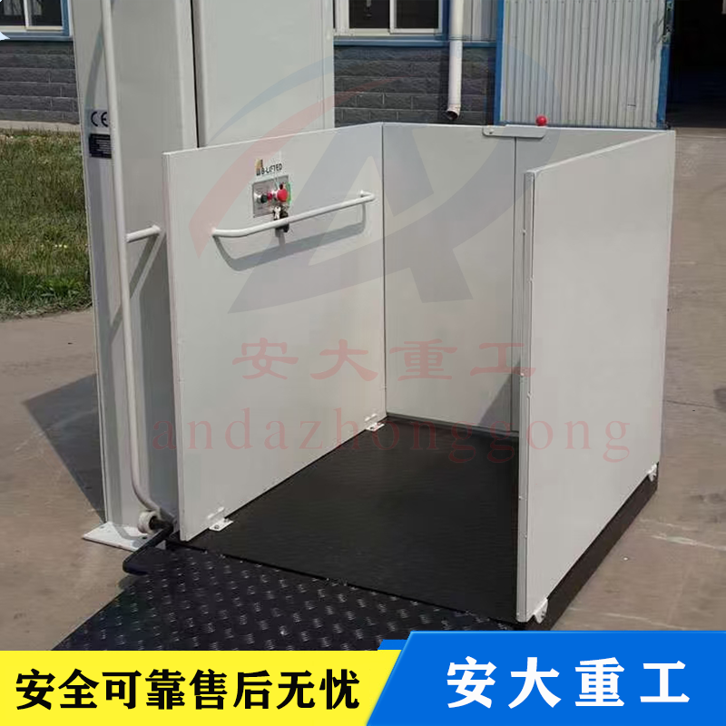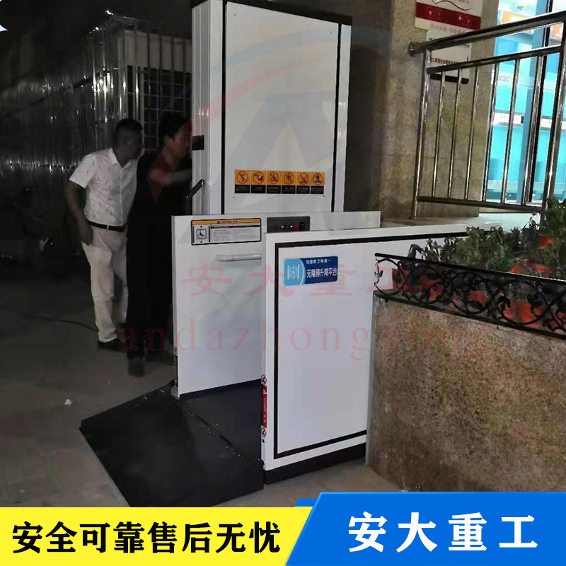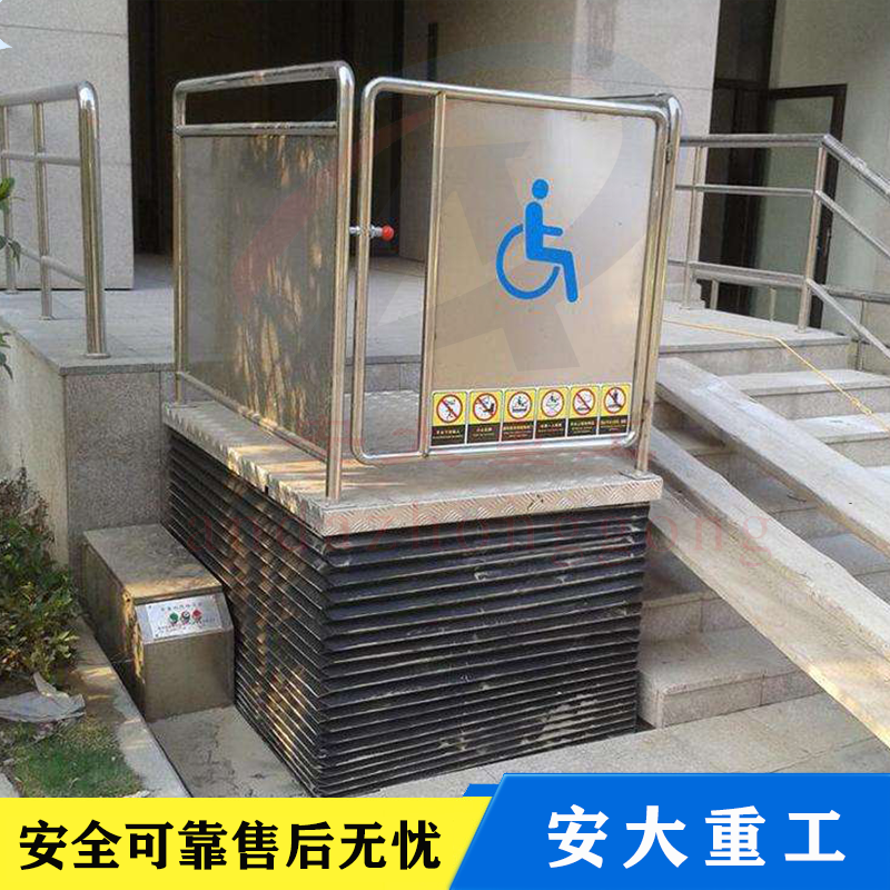 無障礙升降平臺由升降平臺、導(dǎo)軌和驅(qū)動箱等三大部分組成:升降平臺是由C型鋼材為主體部件,采用“翹橋自復(fù)位開關(guān)操作運行”,無基坑式安裝,直接固定于混凝士地面(無底抗室外應(yīng)用情況下,平臺下方混凝土地面不得低于周圍地面),手動液壓閥打開時升降底板能手動下降;液壓驅(qū)動,升降平穩(wěn)安全,外部采用拉絲不繡鋼材料和鋁板靜電噴塑機箱佰板,外形小巧美觀,不阻得周邊環(huán)境。殘疾人升降機直接安裝于地面,無需土建配套地坑,施工簡便,產(chǎn)品放置戶外不易積水,不易生繡,維護簡便,升降高度1-6米。